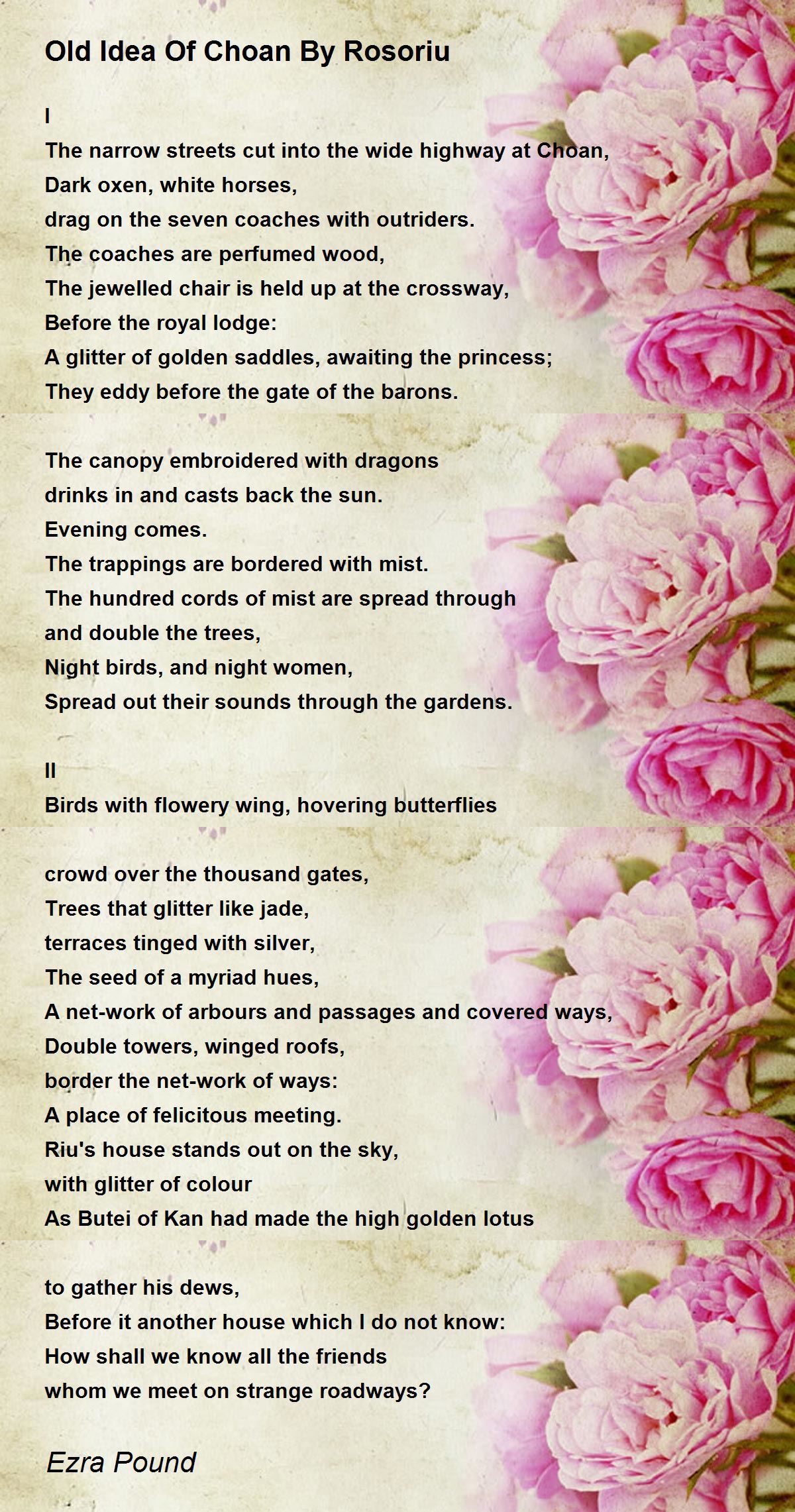 Petals on a wet, black bough. It was published in the united states in july 1913 by small, maynard and co of boston. He became known for his role in developing imagism, which, in reaction to the victorian and georgian poets, favored tight language, unadorned imagery, and a strong correspondence between the verbal and musical qualities. In just two lines, pound seeks to capture the fleeting impression.