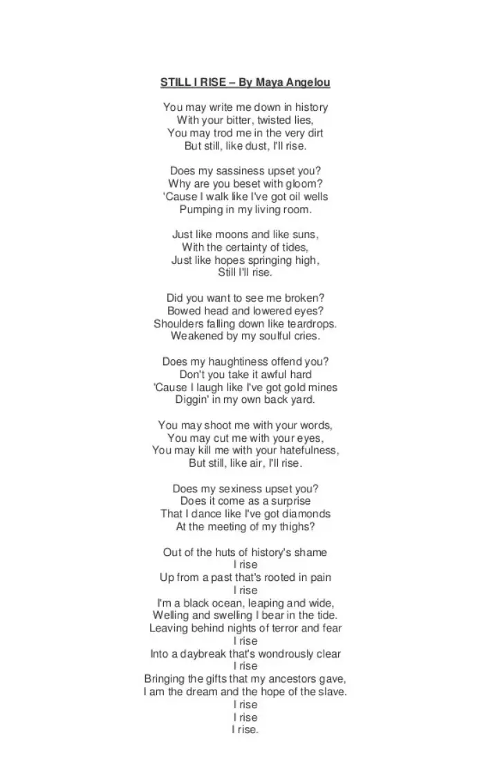 Download Still I Rise Poem Pdf PNG. Maya angelou, still i rise from and still i rise: Does my sexiness upset you?
