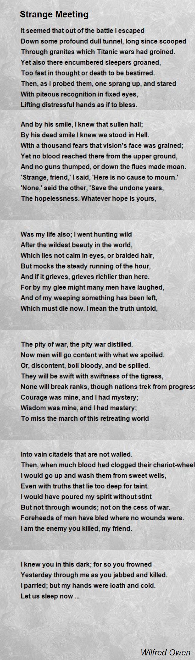 Two soldiers meet up in an imagined hell, the first having killed the second in battle. Strange meeting is a poem by wilfred owen. Strange meeting is a poem by wilfred owen. The power of this poem lies in owen's use of symbolic language rather than in his creation of imagery.