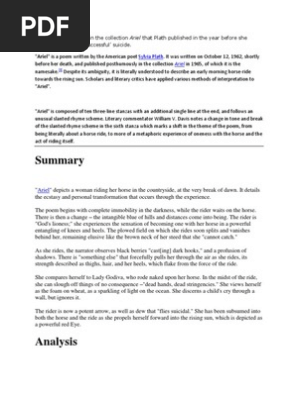Ariel, the title poem of sylvia plath's posthumous volume of the same name is one of her most highly regarded, most often criticised, and most the ambiguities in the poem begin with its title, which has a three fold meaning. Then the substanceless blue pour of tor and distances. This edition of ariel by my mother, sylvia plath, exactly follows the arrangement of her last manuscript as she left it. Read ariel from the story poetry by sylvia plath by gonerogue13 (gonerogue) with 1,501 reads.