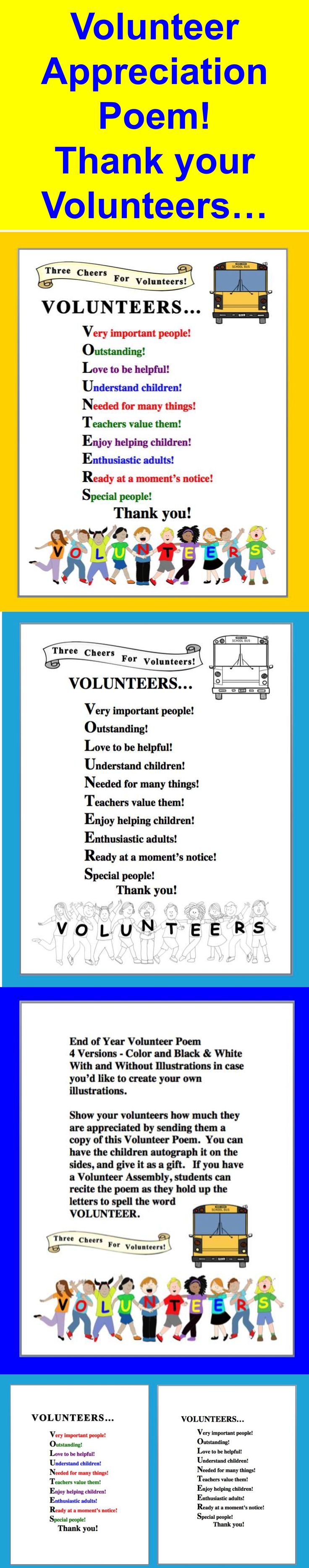 For example, some people feel appreciated from simply words of affirmation, others likes tangible gifts and others enjoy spending time with leadership. Many volunteers are specifically trained in the areas they work, such as medicine, education. The following thank you appreciation poem notes assistance unselfishly given. Where would we be without the many volunteers that help out everyday, all over the country?