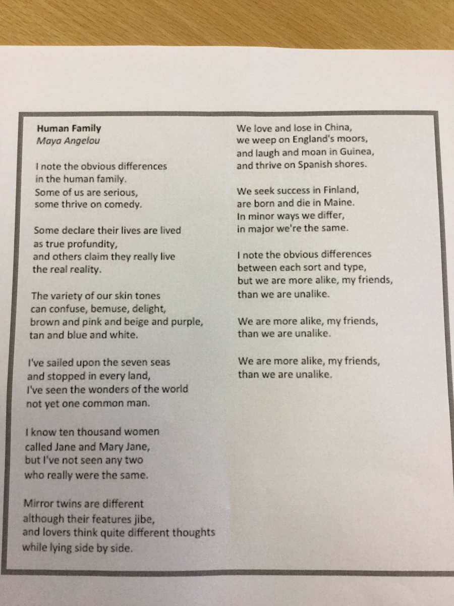 View Human Family Poem Pics. I note the obvious differences in the human family. In this poem maya angelou addresses a variety of minute differences that can be seen throughout the human family: