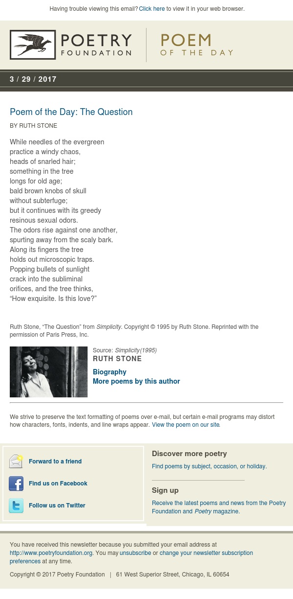 4.22 avg rating — 105 ratings — published 2008 — 6 editions. In this piece incorporating ants, housework and albert einstein, us poet stone moves easily from the colloquial to the cosmic. In 1959, after her husband, professor walter stone, committed suicide, she raised 3 daughters alone. Ruth stone poems, quotations and biography on ruth stone poet page.